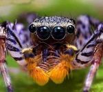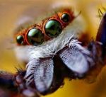 Salticids are small (most are less than one inch long), and they can jump 10 - 40 times their body length to pounce on prey or to avoid becoming prey. They accomplish this using good ol' fashioned hydraulics: they pump fluid into their legs quick enough to allow them to spring at lighting speed. Enjoy these photos. Click on some of them and you'll almost be able to see the reflection of the camera in their central eyes. My favorite is the last one. He looks like he's been naughty and is hiding from his parents. Who could chastise the little guy, with his liquid eyes and furry pedipalps? The eaighth one is awesome too. Text source Photos via: PopGive.com